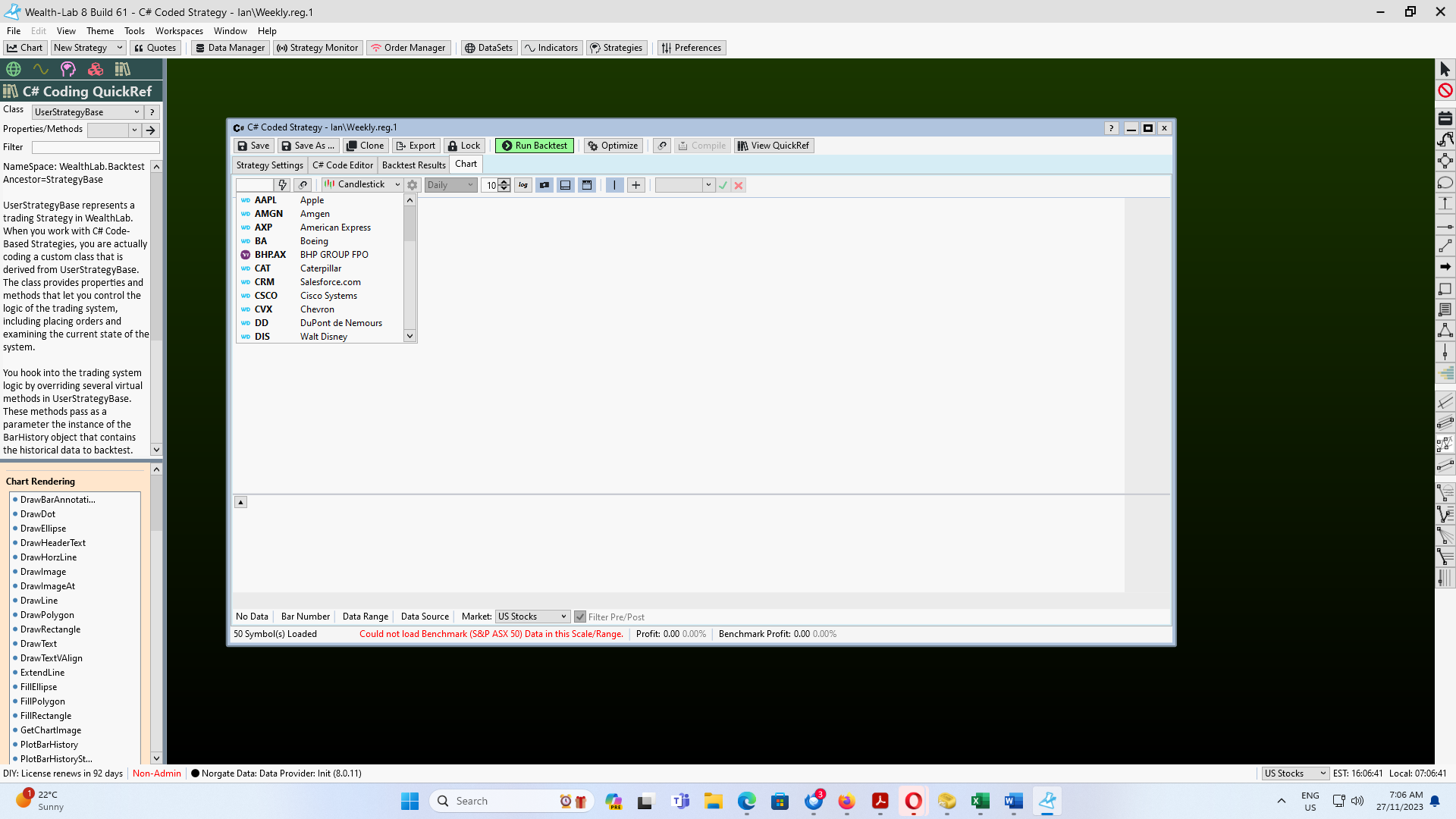 You need to correct the benchmark symbol. See in your second screenshot where at the bottom it indicates "Could not load Benchmark (S&P ASX 50) Data in this Scale/Range. It seems like you're trying to use a DataSet name rather than a single symbol that is used to represent the S&P ASX 50 index. If you want to use S&P ASX 50 as your benchmark you need to determine the symbol for it per some data provider. It looks like you're using Norgate. I don't have Norgate, so I don't what that symbol is.