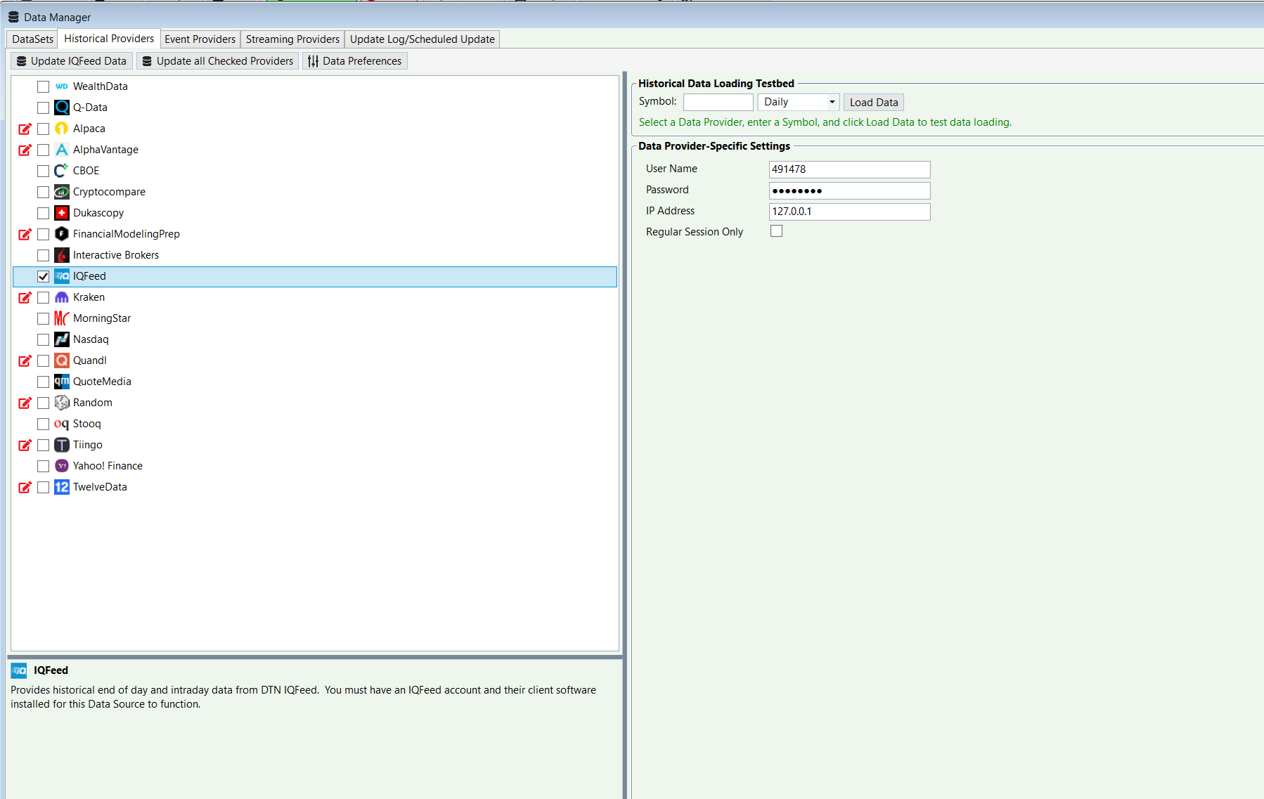 After further debug, I found back testing works fine during trading session, but before of after market it gets stuck loading data. I loaded latest IQfeed and updated all extensions etc. Data Manager and updating works fine. How do I know if IQfeed is being used after or before market in the back test?