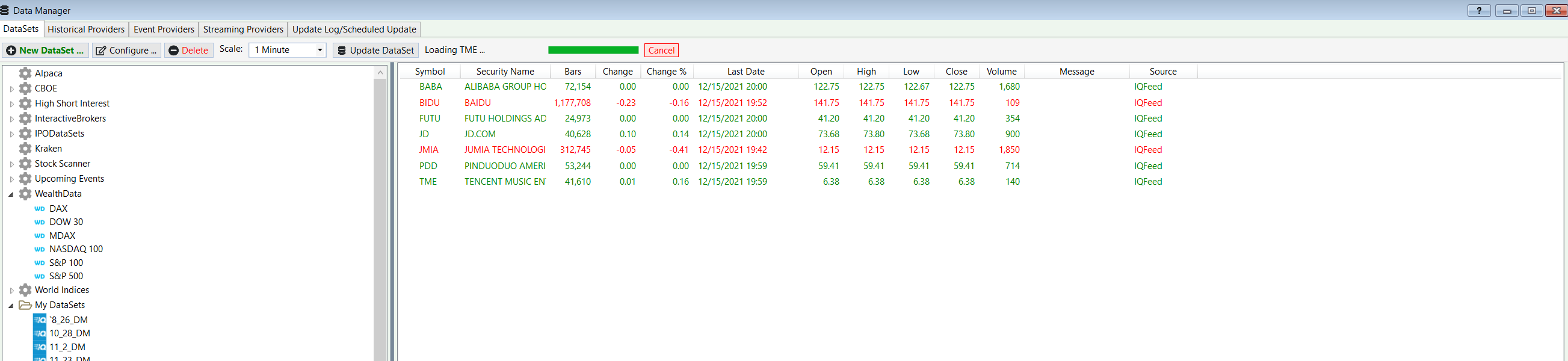 It sits on the last symbol for 10min. Then when I take the symbol from the updated dataset and drag it into the backtest chart it also gets stuck for a while. So even the updated dataset does not backtest at the speed previously.