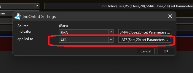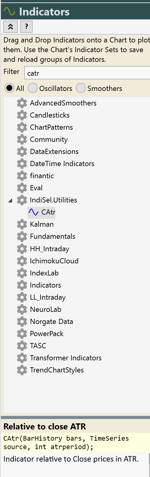 It would not make sense to have the first drop down include things like ATR (or CAtr), because the first parameter of ATR is a BarHistory, not an Indicator.