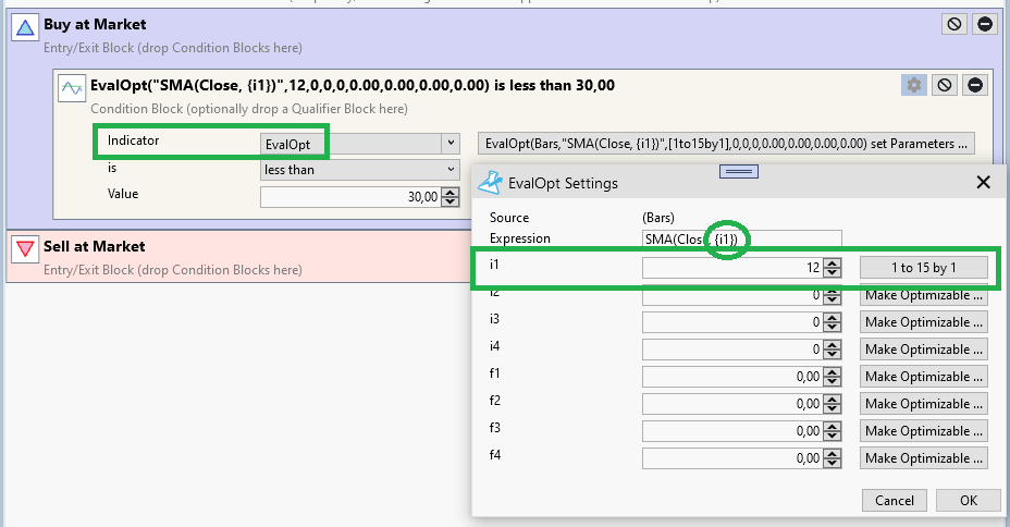 Thanks for your explanations. The EVAL Indicator works fine with that. But I like to optimize the indicators and for that I need the indonind indicator (EVAL is not optimizeable-thats a pitty).