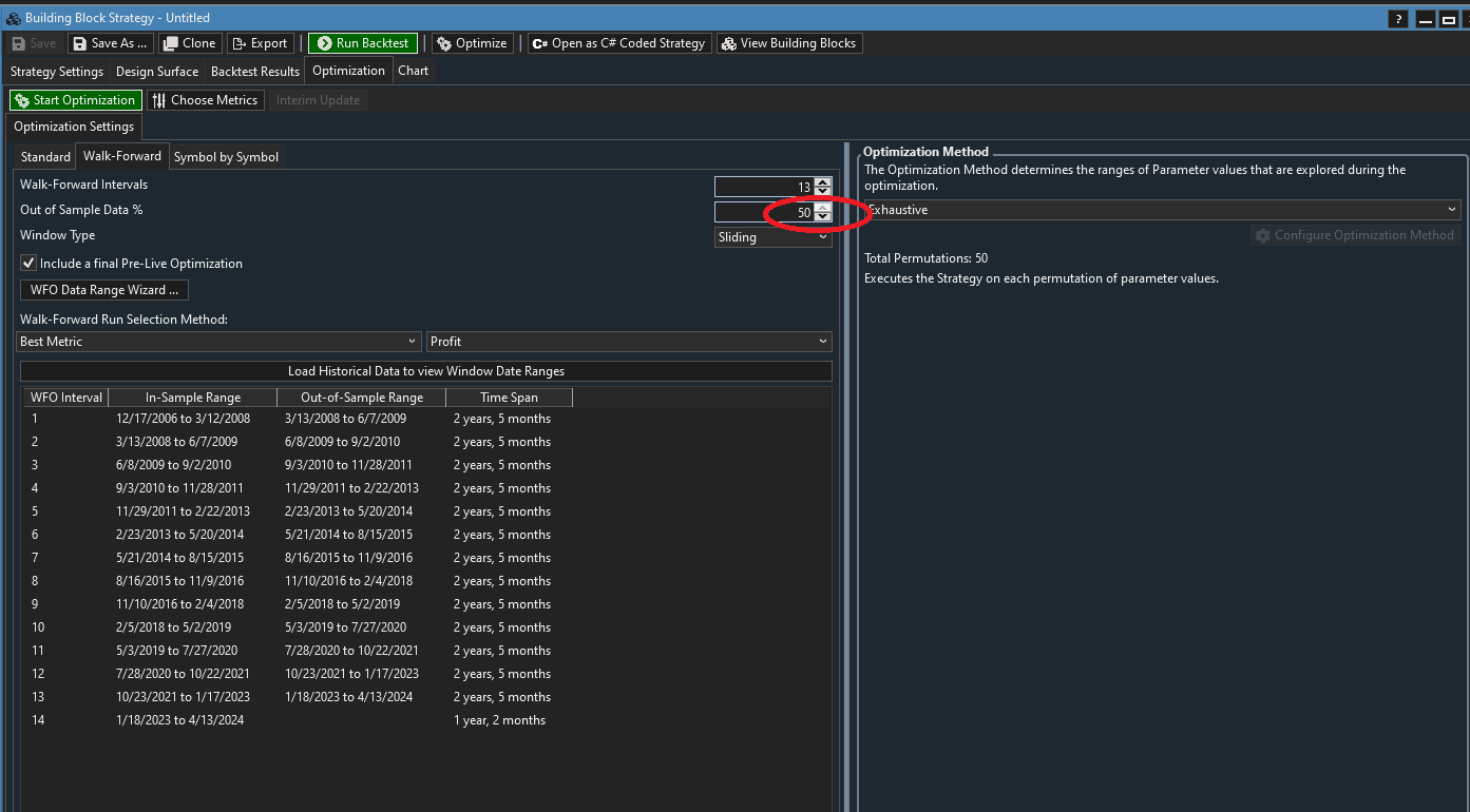 Just a basic question. I am using block strategies and the WFO does not allow me to increase the OOS Data % above 50%. Is it possible and I am just missing some other setting? I have included a screenshot of what I am talking about.