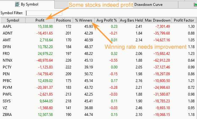 CODE:Based on the results below, it appears this strategy works well with some stocks but not others. And the winning rate could use some improvement. But thanks a bunch for the help and ideas.