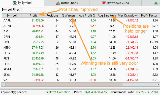 Below are the improved results you can compare with Post #3. There is better profit because the positions are held for more bars. But the winning rate has not improved much. I would like to see a winning rate of 65 to 70% for a production strategy; this strategy needs more plants on its entry criteria.