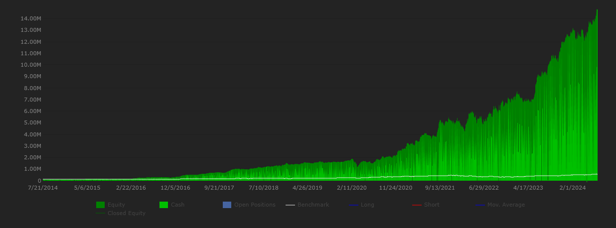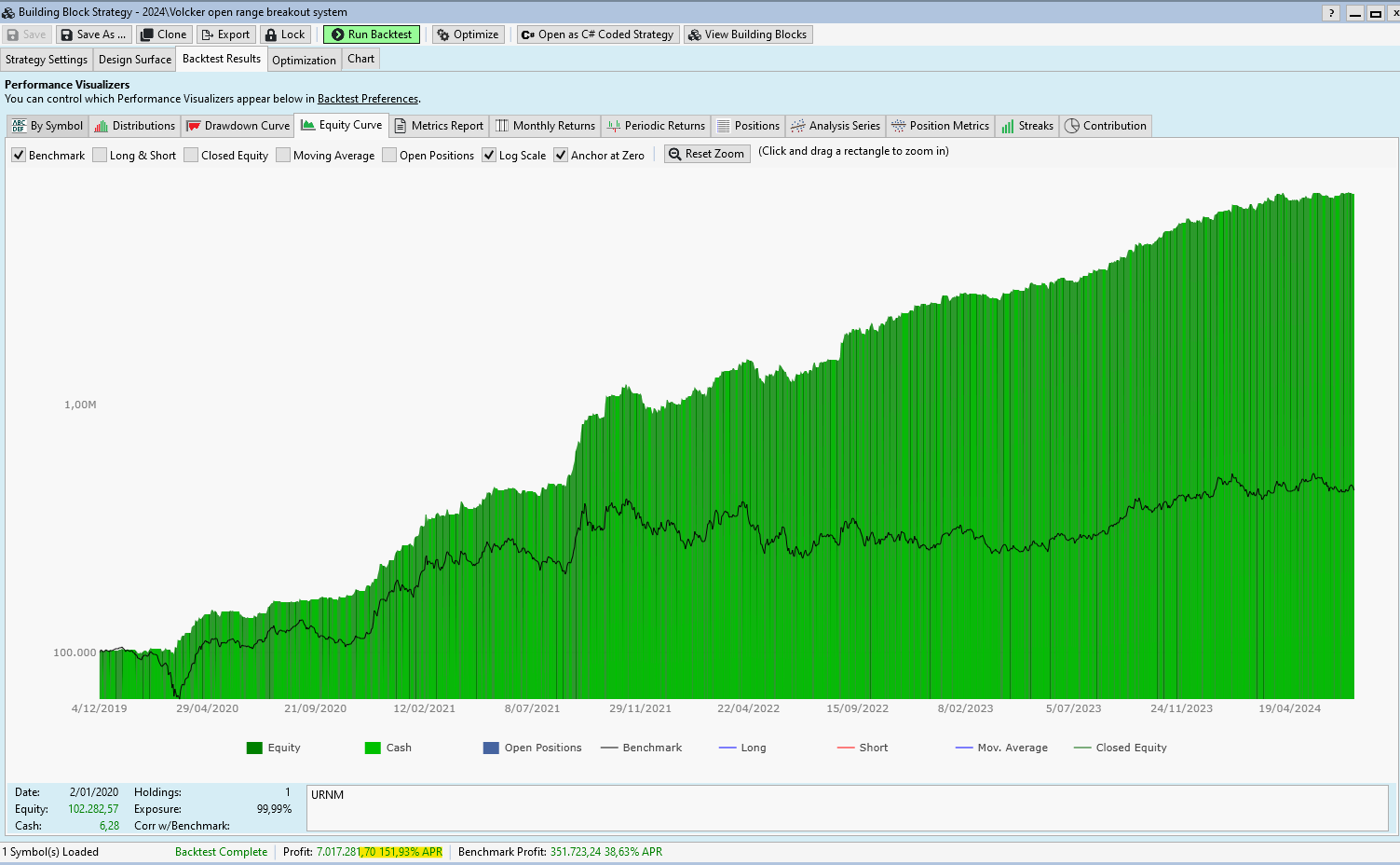 - Running on a DataSet of 3 symbols (URA, TQQQ, and NXE) resulted in an annualized return of 64.90%, and observing the by-symbol equity curves revealed that the symbols were complimentary.