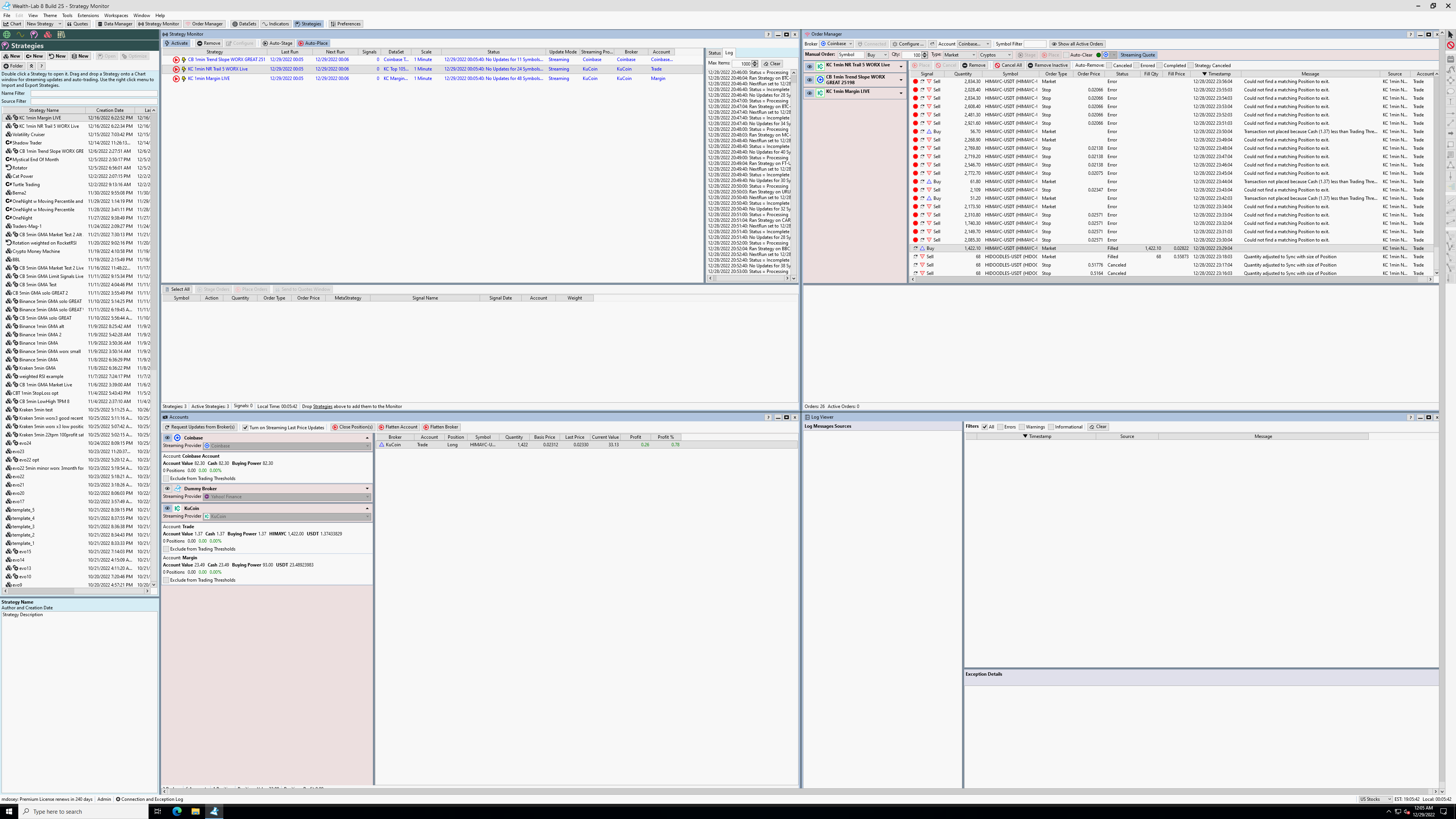 I was running a Long strategy using KuCoin tonight, and after a successful "Buy" order, all of the "Sell" orders in the Order Manager show "Could not find a matching Position to exit". But the position exists. After I pressed "Request Updates from Broker" in the "Accounts" panel, it was visible.