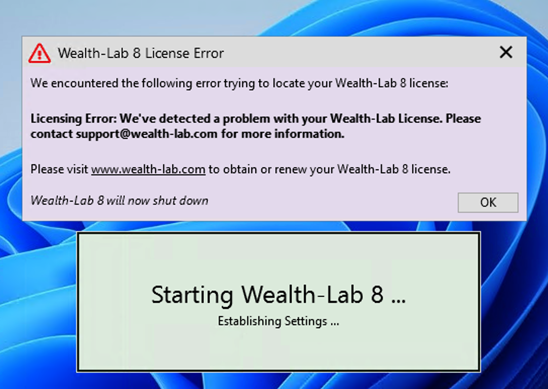 I keep running into this error on my VM and there's no way to get past this window. I've tried reinstalling Wealthlab but no luck. any solutions?