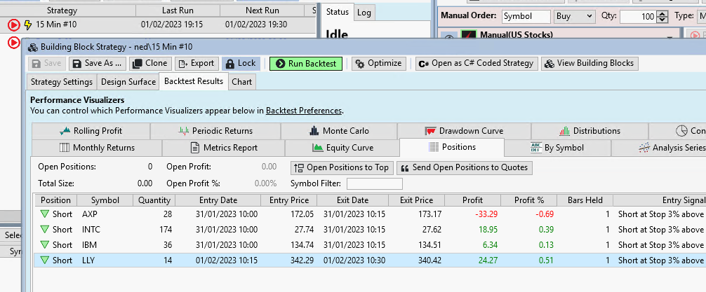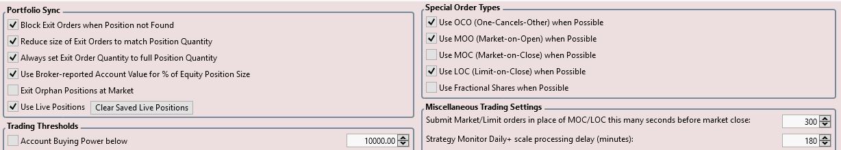 The first is Live Positions. When enabled, the strategy will discord any theoretical position and inject the position returned by the broker API. The limitation here is that the broker returns a single position per symbol so if you trade multiple strategies on the same symbol(s) or strategy that itself maintains multiple positions then this probably won’t work well.