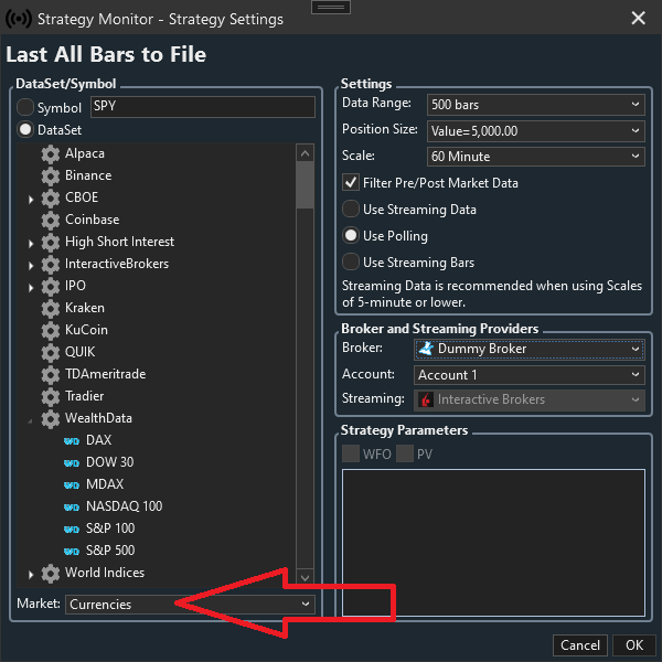I don't see an option to indicate the market in datasets or backtest window. If that setting is in the main window at the bottom, I changed it.