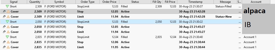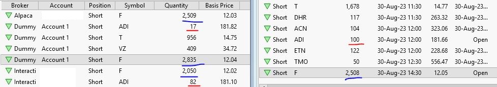 Quantity does not match. All accounts including backtest have ~100k. Max risk 0.05% is used, so the quantity must match. If we compare F, then the quantity matched only in alpaca, but did not match on IB, and even more on Dummy Account. ADI also does not match between backtest and IB. So is Dummy Account.