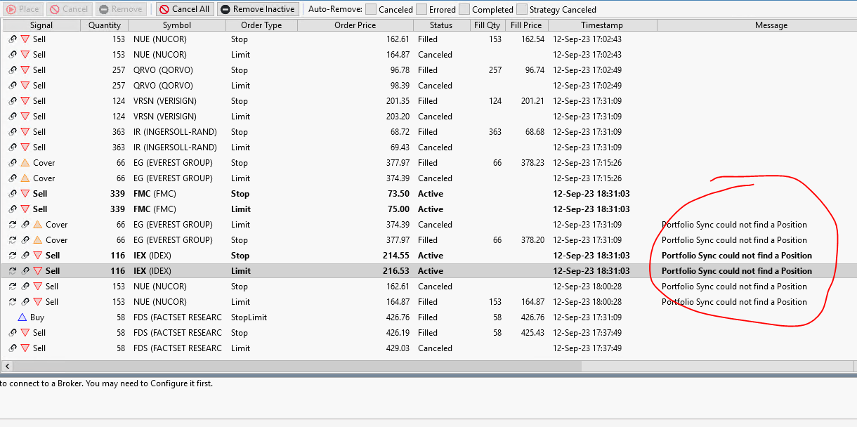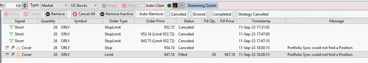 I see an order to cover 26 shares of ORLY. But the IB account is LONG ORLY, not short. So that signal failed, issuing the message "Portfolio sync could not find a position." But the signal was somehow submittied to IB, did you maybe click it and submit it manually?