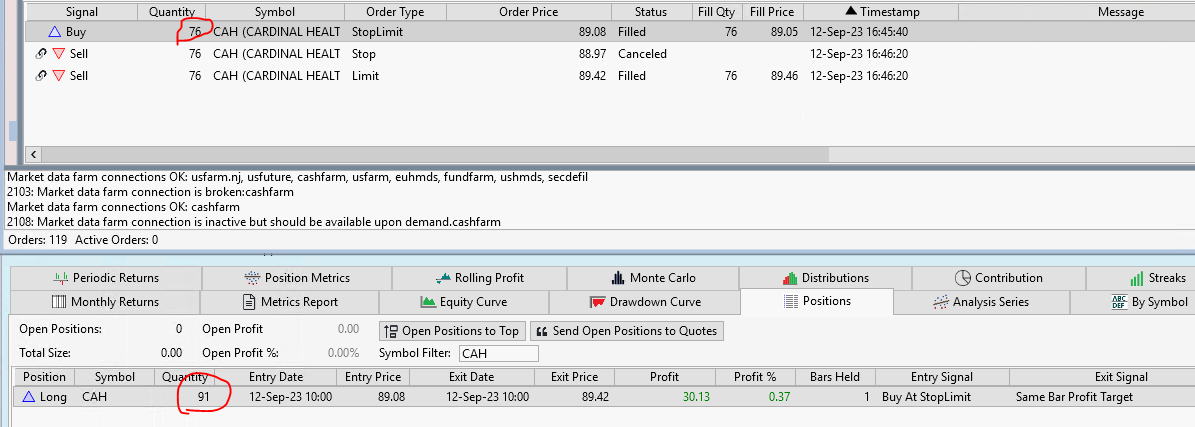 I use 0.05% risk. IB paper account is set to 100k, so the backtest. I can still understand that the transactions are different, since it is a paper account and perhaps due to quotes and execution, but money management is radically different. I enter stop and buy limit orders, so I don't see how there can be such a difference. You can also notice that orders sent to the broker have a different amount than positions in the backtest