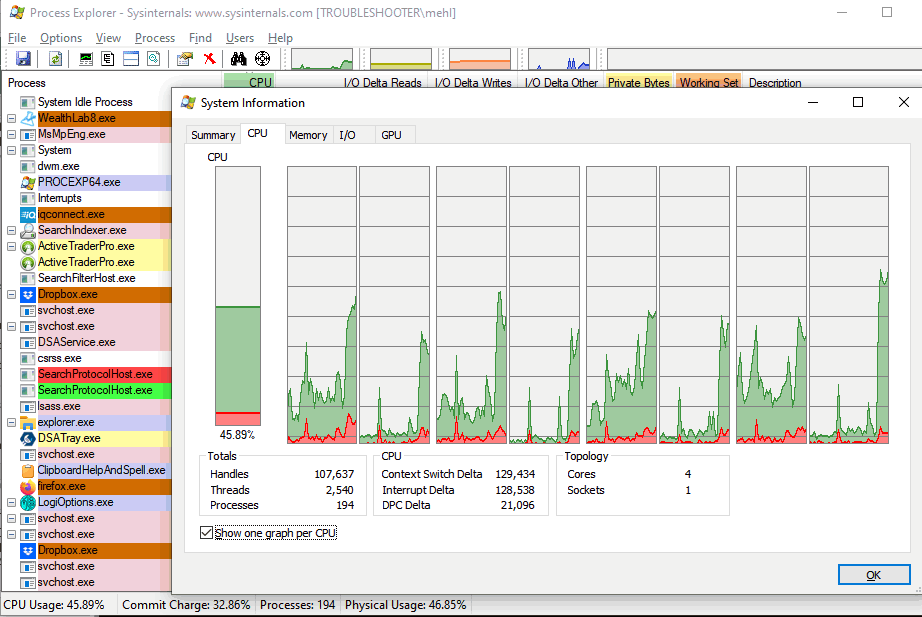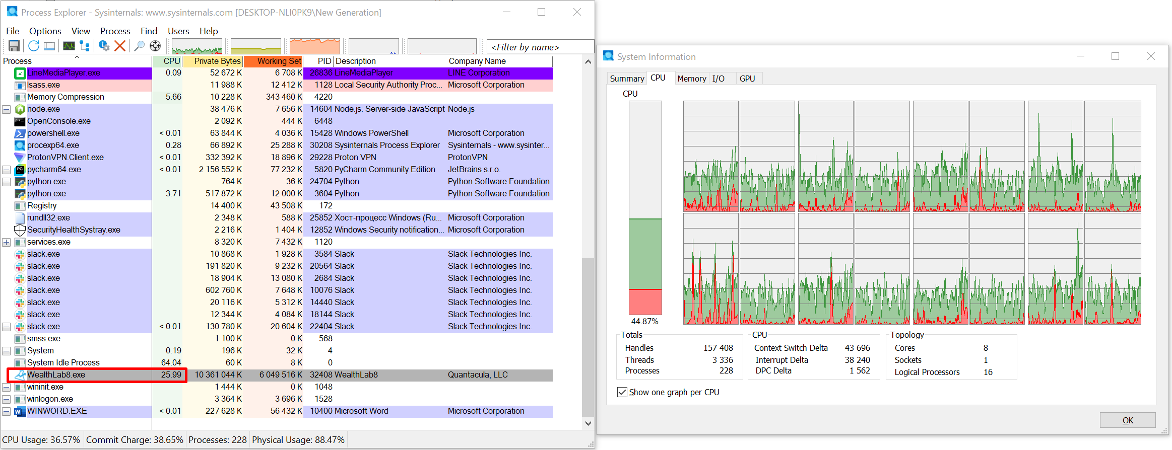 Thank you for your detailed answer. I've attached the Process Explorer screenshot showing all cores during WealthLab optimization as requested.: