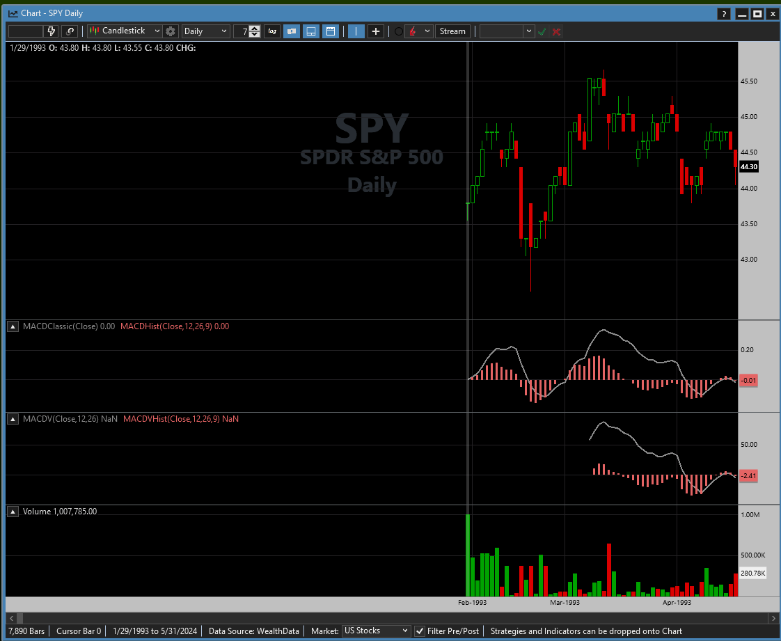 Virtually *all* MACD indicators/variations are affected with one/both issues. e.g. while MACDV begins plotting at bar 26 (which is correct) so does the histogram (which is incorrect):