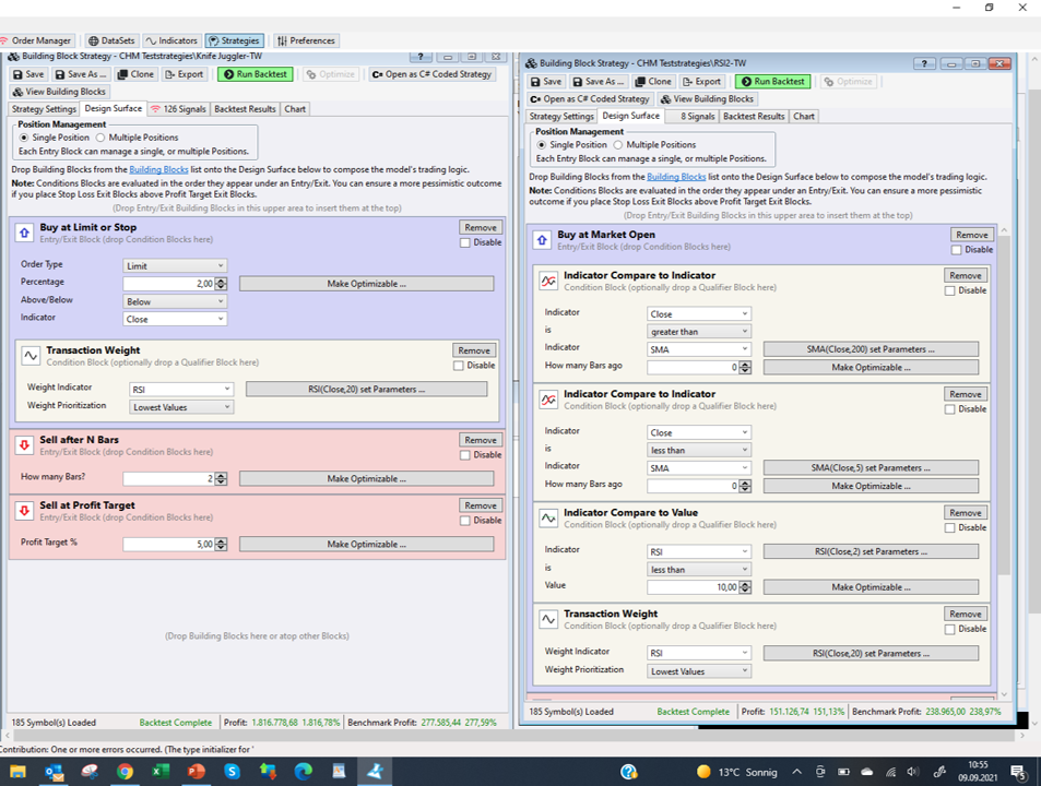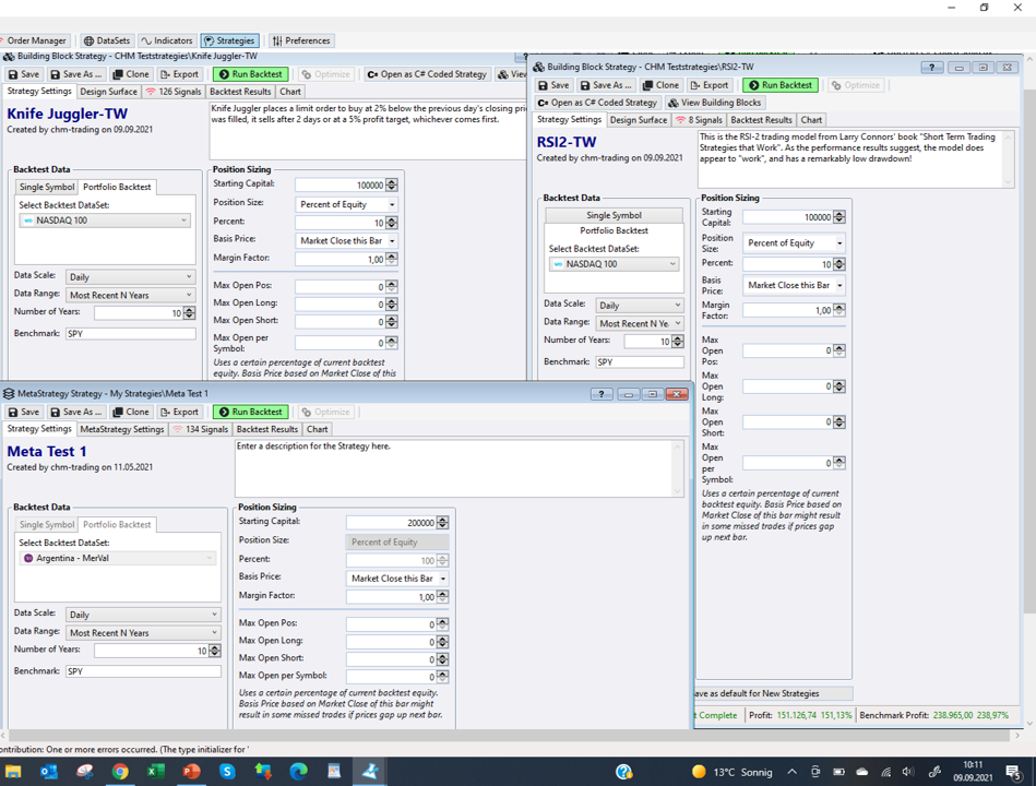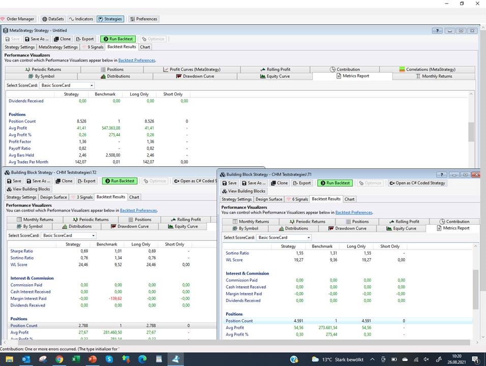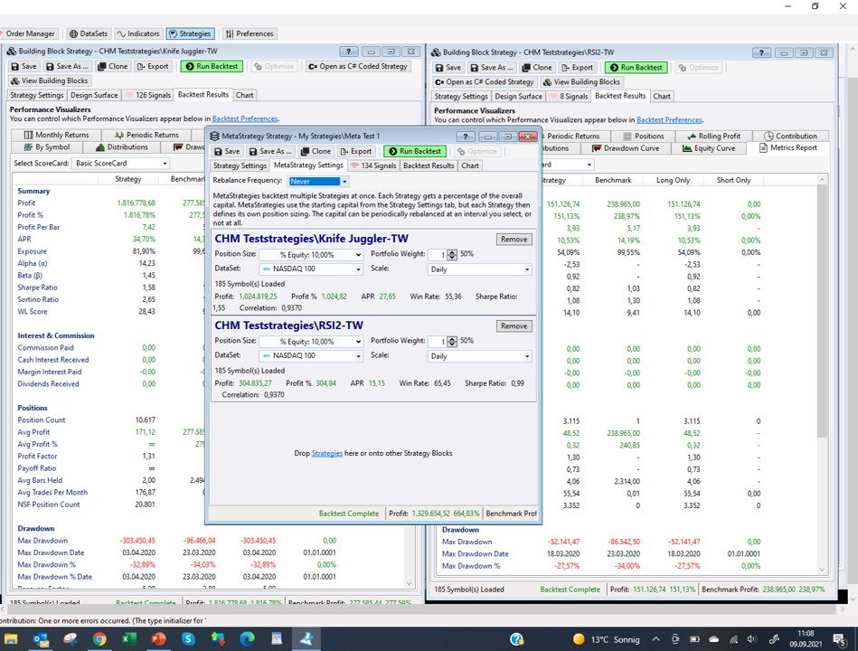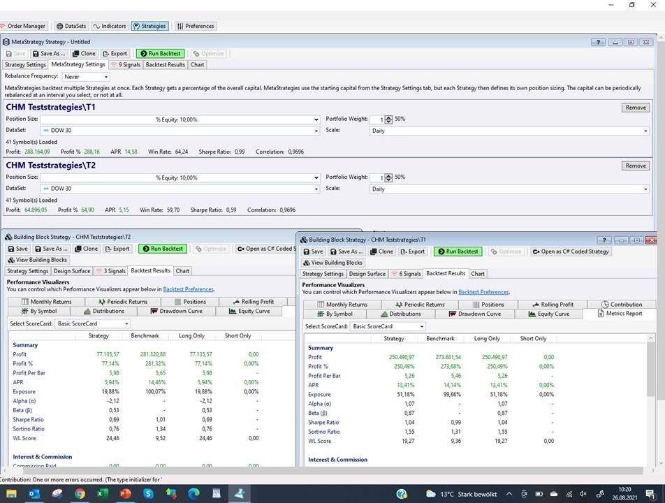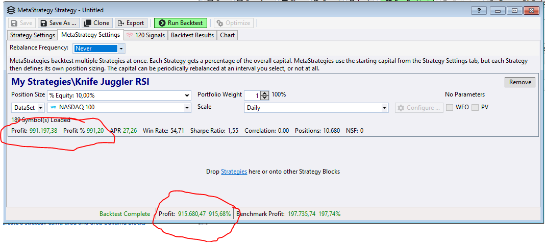 I tried to use a single strategy in the meta strategy builder. As there is only one strategy the result of the meta strategy and the individual strategy should be the same (whatever strategy you are using). But as you can see in the screenshot there are different values shown on the screen.