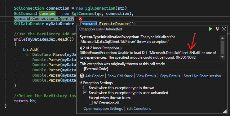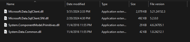 Thanks @paul1986. My project targets .Net8. The linked article suggests using System.Data.SQLClient (legacy method). I'm using Microsoft.Data.SQLClient. Since WL is using .net8, I'm pretty sure Microsoft.Data.SQLClient is the right library to use, and the connection does work. But, WL is loading all dll's found in the install location and the Microsoft.Data.SQLClient.SNI.dll is not intended to have direct references. I might try reverting to an earlier version of the SQLClient to see if that make any difference.