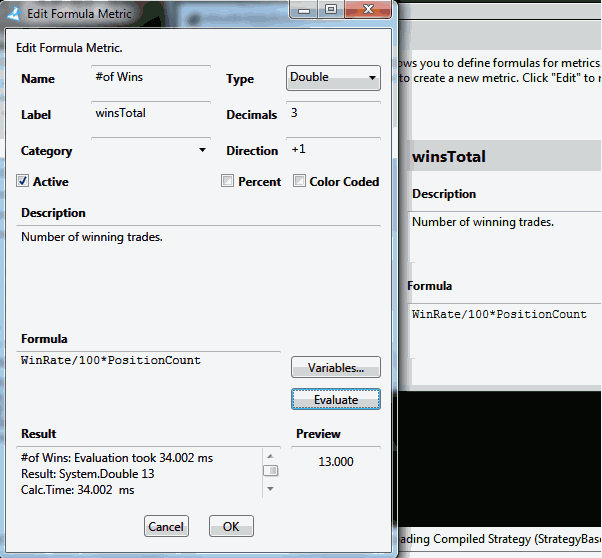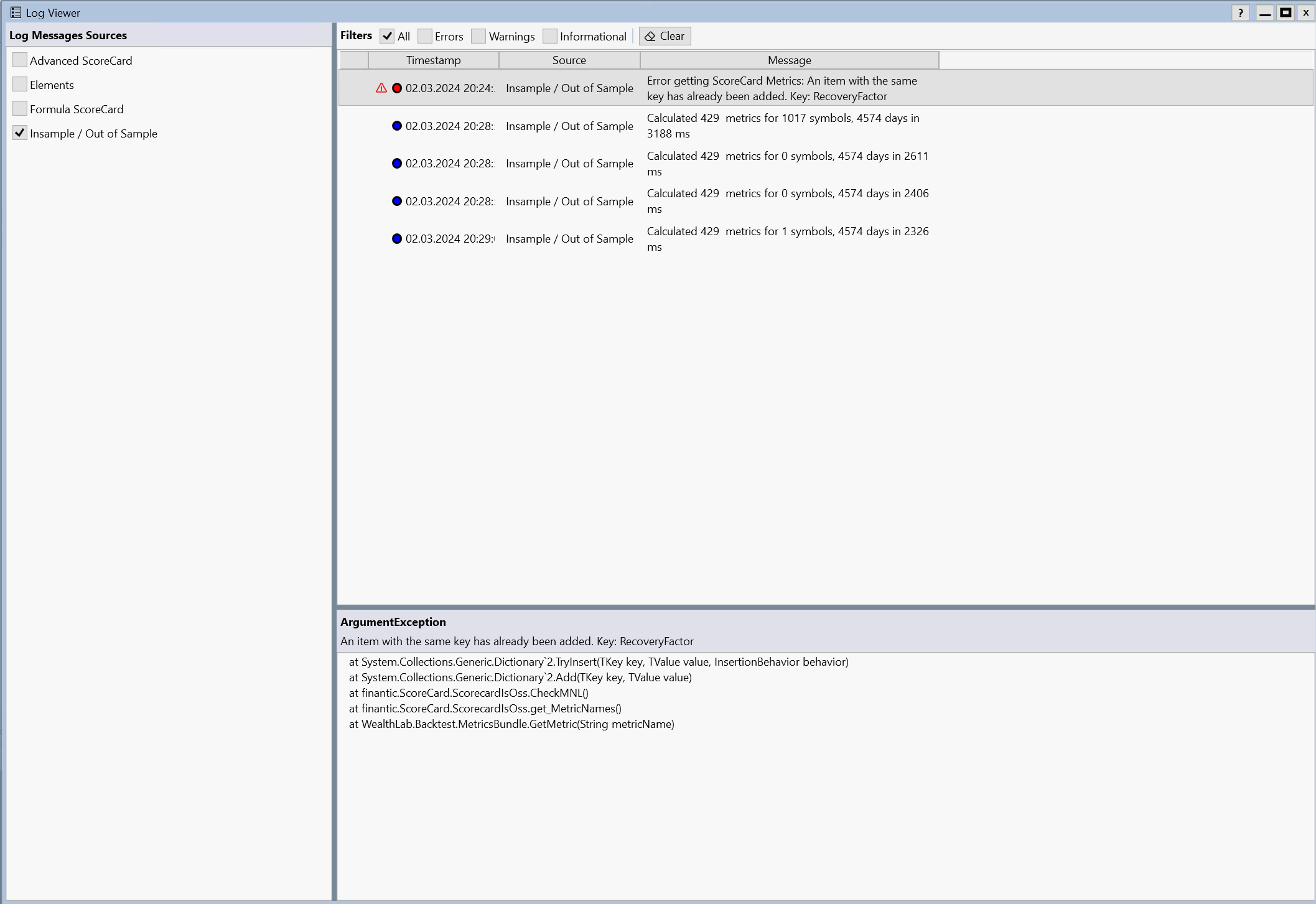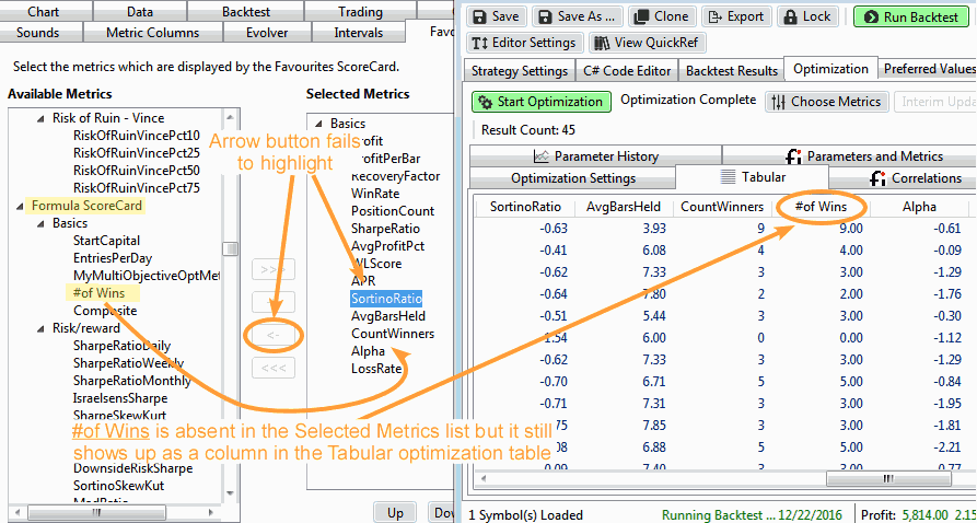 I defined two custom finantic.ScoreCard metrics, #ofWins and Composite. After optimization, the #ofWins column is empty (see screenshot) and the Composite column isn't even showing. I restarted WL Build 49, but that didn't help. I'm running finantic.ScoreCard Build 5 and the Shrinking Window optimizer. How do I fix this?