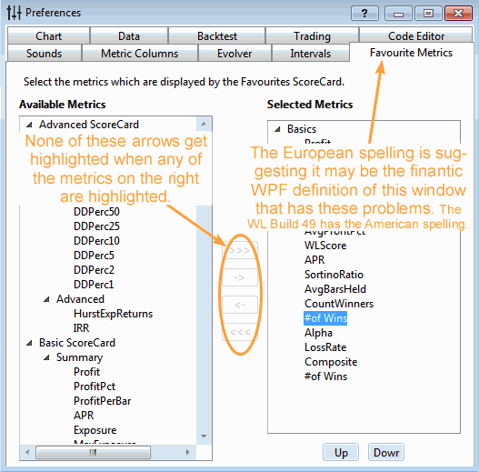 That Favourite Metrics pane has several problems. When I originally setup it up, I had many "other WPF windows" open at the same time, which may have confused things as far as getting anyone to reproduce this WPF problem. What I did was delete all the Favourite Metrics, then restart WL. What's weird is that action did not delete them! They reappeared--after deletion--like magic.