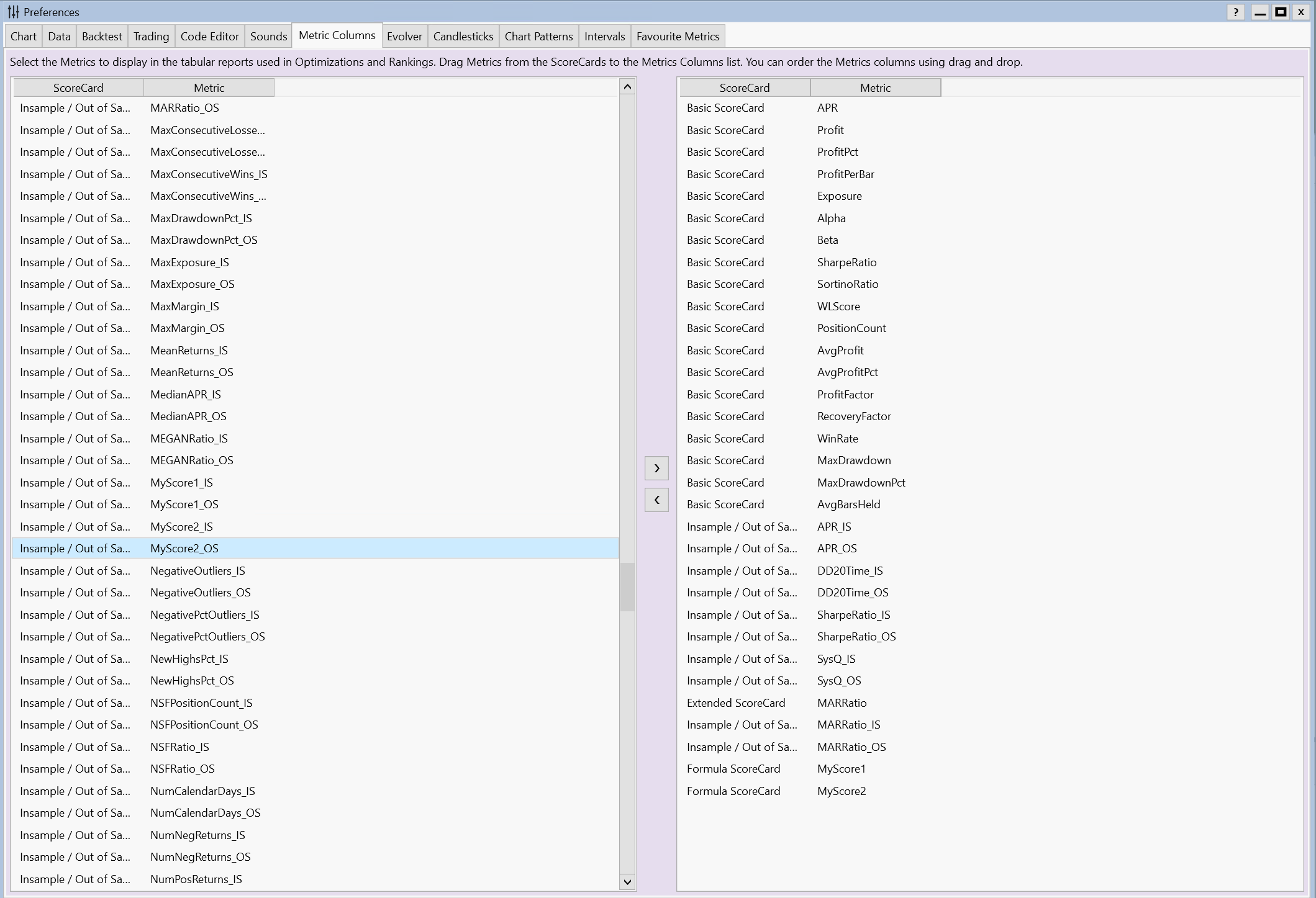 I have defined two of my own performance indicators (MyScore1, MyScore2). They were created via the Formula ScoreCard editor and are also available (e.g. in the Formula ScoreCard. However, I cannot find any corresponding MyScore1_IN, MyScore1_OS etc. on the Insample/Out of Sample ScoreCard. On the Preferences -> Metric Columns page, I can see the corresponding entries on the left-hand side (but this is also the only place I have found), but I cannot transfer them to the Metric Columns list (see image).
