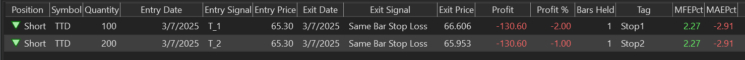 T_1 should exit with Stop 1% and T_2 should exit with Stop of 2%, but WL8 does it the other way around.