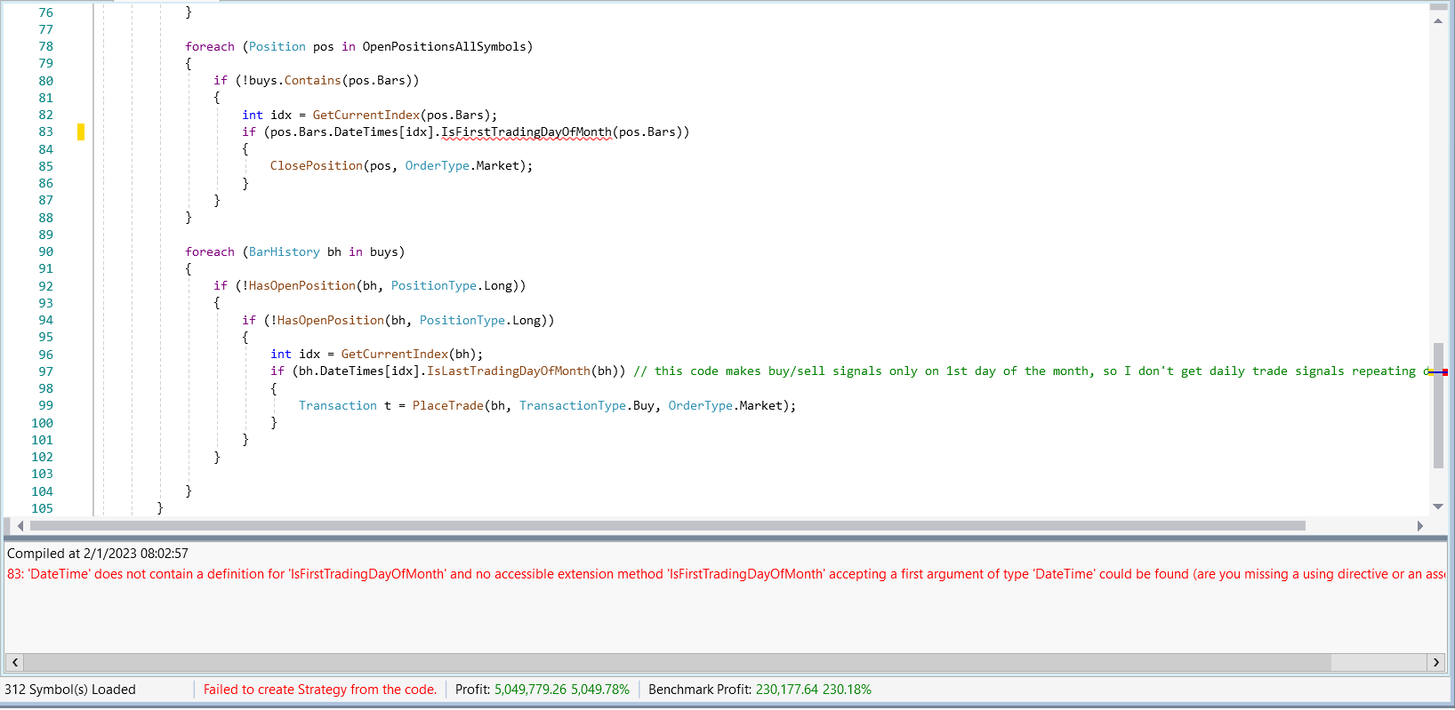 foreach (BarHistory bh in buys) { if (!HasOpenPosition(bh, PositionType.Long)) { int idx = GetCurrentIndex(bh); if (bh.DateTimes[idx].IsLastTradingDayOfMonth(bh)) { Transaction t = PlaceTrade(bh, TransactionType.Buy, OrderType.Market); } } }