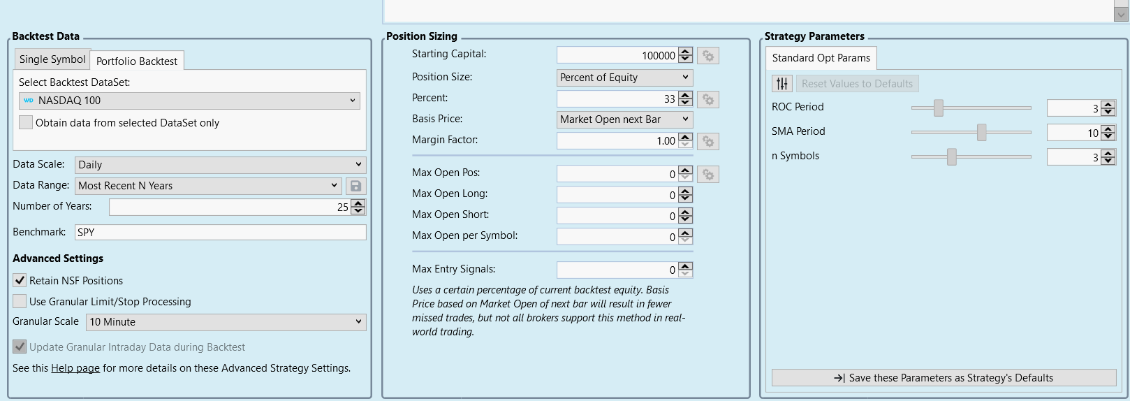 using WealthLab.Backtest; using System; using WealthLab.Core; using WealthLab.Indicators; using System.Drawing; using System.Collections.Generic; namespace WealthScript1 { public class Rotation : UserStrategyBase { public Rotation() { AddParameter("ROC Period", ParameterType.Int32, 3, 1, 10, 1); // Default = 3 AddParameter("SMA Period", ParameterType.Int32, 10, 3, 15, 1); // Default = 3 AddParameter("n Symbols", ParameterType.Int32, 3, 2, 5, 1); // Default = 3 } ROC _avgROC; SMA _smaBenchmark; BarHistory _bmBars; string _seriesKey = "Average ROC"; string _bmSymbol = "^GSPC"; //the list of symbols that we should buy each bar private static List<BarHistory> buys = new List<BarHistory>(); //create the weight indicator and stash it into the BarHistory object for reference in PreExecute public override void Initialize(BarHistory bars) { StartIndex = Math.Max(Parameters[0].AsInt, Parameters[1].AsInt); _avgROC = ROC.Series(bars.Close, Parameters[0].AsInt); bars.Cache[_seriesKey] = _avgROC; _bmBars = GetHistory(bars, _bmSymbol, "Major U.S. and world indices"); _smaBenchmark = SMA.Series(_bmBars.Close, Parameters[1].AsInt); } public override void PreExecute(DateTime dt, List<BarHistory> participants) { // LARRY PUT THIS IN AS A TEST TO CREATE THE VARIABLE isFirstTradingDayOfMonth bool isFirstTradingDayOfMonth = idx > 0 ? bars.DateTimes[idx - 1].IsLastTradingDayOfMonth(bars) : false; //store the symbols' _avgROC value in their BarHistory instances foreach (BarHistory bh in participants) { TimeSeries symbolRoc = (TimeSeries)bh.Cache[_seriesKey]; int idx = GetCurrentIndex(bh); double rocVal = symbolRoc[idx]; if (idx <= symbolRoc.FirstValidIndex) rocVal = -1.0e6; bh.UserData = rocVal; //save the current _avgROC value along with the BarHistory instance } //sort the participants by _avgROC value (highest to lowest) participants.Sort((a, b) => b.UserDataAsDouble.CompareTo(a.UserDataAsDouble)); //keep the top 3 symbols buys.Clear(); //market filter int currentBar = GetCurrentIndex(_bmBars); if (_bmBars.Close[currentBar] > _smaBenchmark[currentBar]) { for (int n = 0; n < Parameters[2].AsInt; n++) { if (n >= participants.Count) break; buys.Add(participants[n]); int idx = GetCurrentIndex(participants[n]); DateTime dte = participants[n].DateTimes[idx]; } } foreach (Position pos in OpenPositionsAllSymbols) { if (!buys.Contains(pos.Bars)) { int idx = GetCurrentIndex(pos.Bars); if (pos.Bars.DateTimes[idx].IsLastTradingDayOfMonth(pos.Bars)) { ClosePosition(pos, OrderType.Market); } } } foreach (BarHistory bh in buys) { if (!HasOpenPosition(bh, PositionType.Long)) { if (!HasOpenPosition(bh, PositionType.Long)) { int idx = GetCurrentIndex(bh); if (bh.DateTimes[idx].IsFirstTradingDayOfMonth(bh)) // this code makes buy/sell signals only on 1st day of the month, so I don't get daily trade signals repeating during the month { Transaction t = PlaceTrade(bh, TransactionType.Buy, OrderType.Market); } } } } } public override void Execute(BarHistory bars, int idx) { } } }