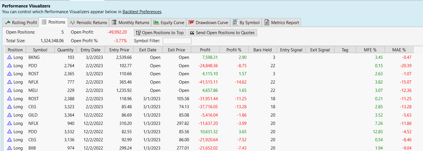 NFLX and MELI are re-signalled. That's why they're not getting closed. I didn't check PDD. Here's code you can substitute for the foreach loop that goes through the OpenPositionsAllSymbols. For the latest month, the buys list has NFLX and MELI in it, meaning they got re-signalled. The debugging code below is very specific to NFLX and MELI, otherwise the debug log gets flooded...