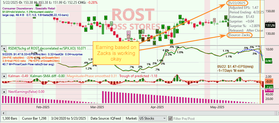 It's happening again. Now earnings work only from zacks, but incorrectly. NextEarningsDate and Morningstar shows nothing. For example ROST stock, on the indicator the previous earnings were long ago, but they were 5/22/25 on the zacks site.