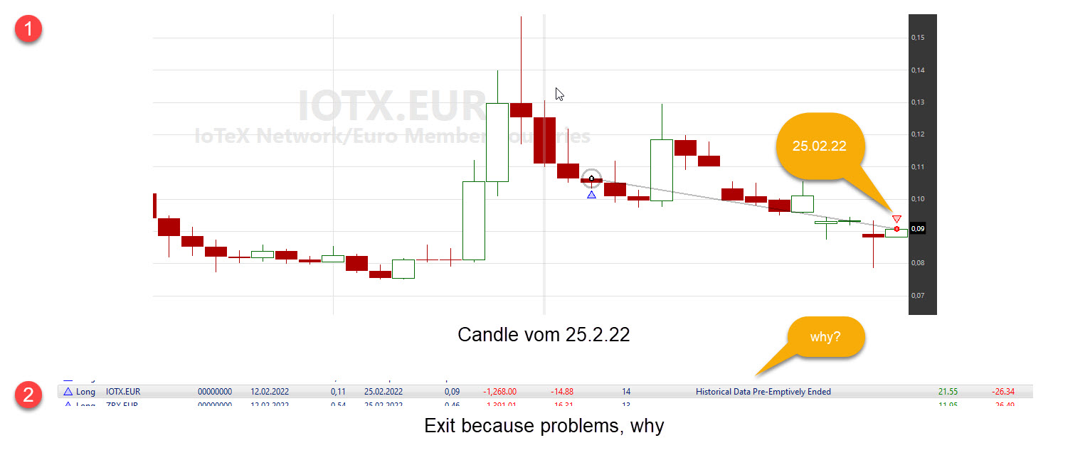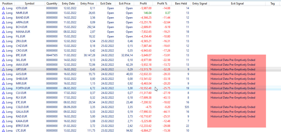 Hello, the problem has been solved overnight. Probably the data from CrCo was problematic. When loading the data directly from an exchange, there was no problem either. So it had to be due to CrCo. Why I do not know. For 75$ per month you can expect more. Does anyone have longer experience with CrCo? Is it a good solution for crypto-data?