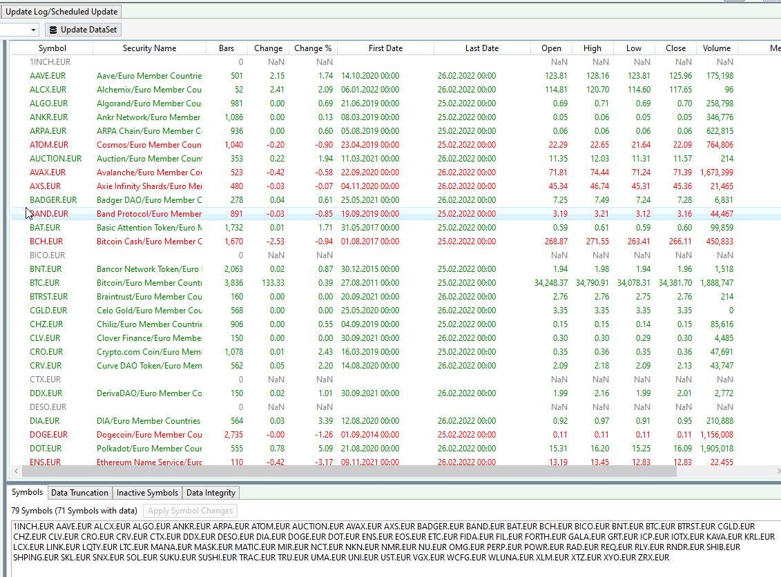 1. Since you focus on cryptos, move Cryptocompare on top of the list of providers. When you highlight the DataSet you backtest on in the Data Manager, what does the Source column show? I mean, are there symbols that do not belong to Cryptocompare? Although BTC.EUR cannot be found in neither WD, QD nor Yahoo but there may be other symbols in your DataSet.