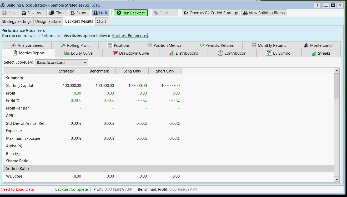Switch to the Strategy Chart view to see what's going on (a screenshot may help). When you do it, you may see that either the chart itself or the event series are empty: "Need to load data" suggests there's lack of data for backtest in the (unknown) data provider or data range. Click the red label to clear it and then update your DataSet. Does it work? If no, you have a data issue. Questions #2, 3, 5 remain unanswered to make us draw further conclusions.