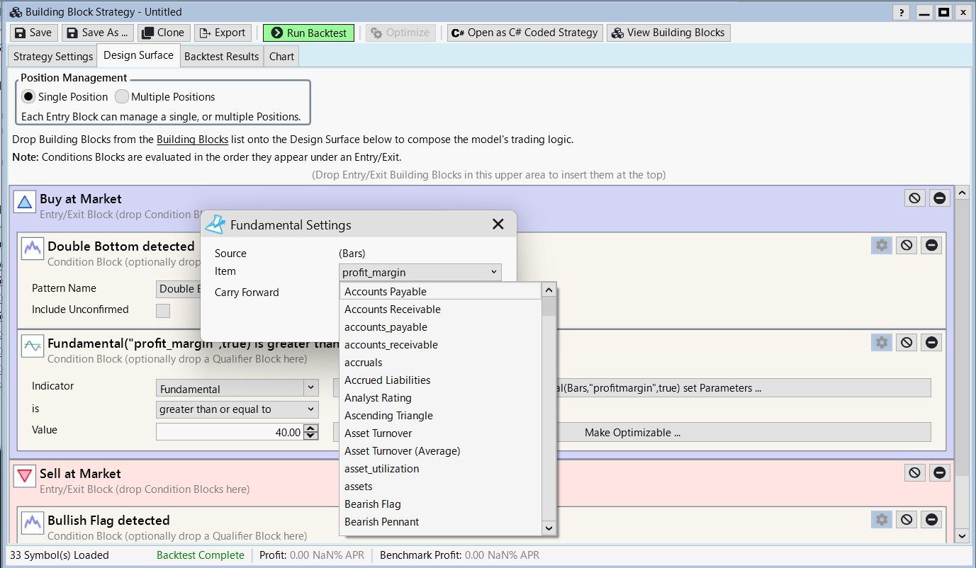 Whenever you select a selectable item from the fundamentals and run a backtest, you will always get an error no matter which indicator you select.