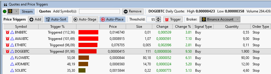 I have now manually switched from Stop to StopLimit for all orders in Quotes. The result is that all are triggered immediately. The 95% threshold does not seem to work.