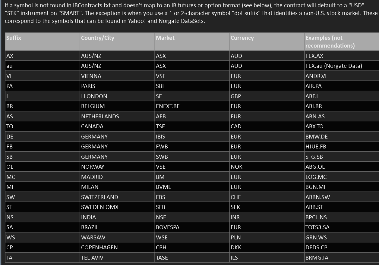 There are sections for each type of instrument, but skip to the bottom and see IBContracts.txt Record Format. Unless the symbol conforms to an option or futures format, you need to define specific contracts that aren't U.S. stocks in IBContracts.txt.