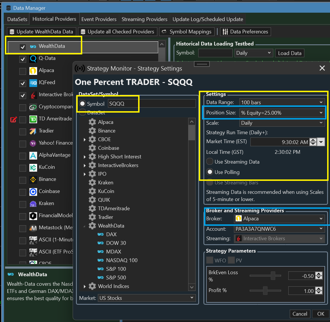 Here's the configuration that should work. (Choose your own Position Sizing and Broker.) Wealth-Data needs to be on top. For supported symbols, Wealth-Data loads immediately with the opening price, which will be the primary market opening price, if it has traded there.