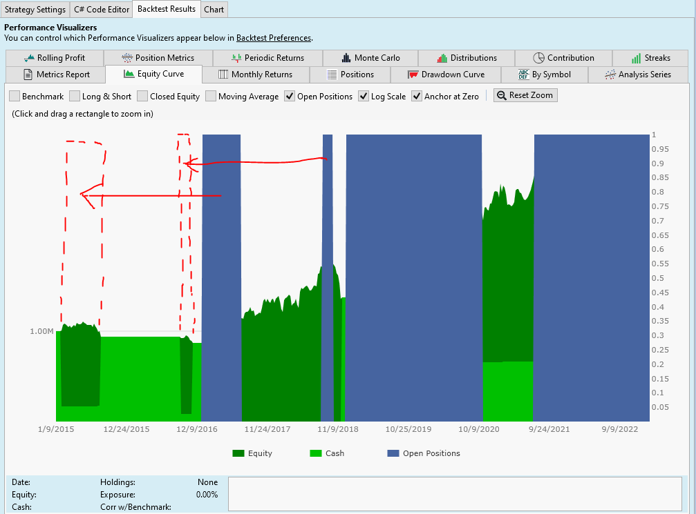 "Open Positions" (blue color) are shifted to the right on the "Equity Curve" tab.