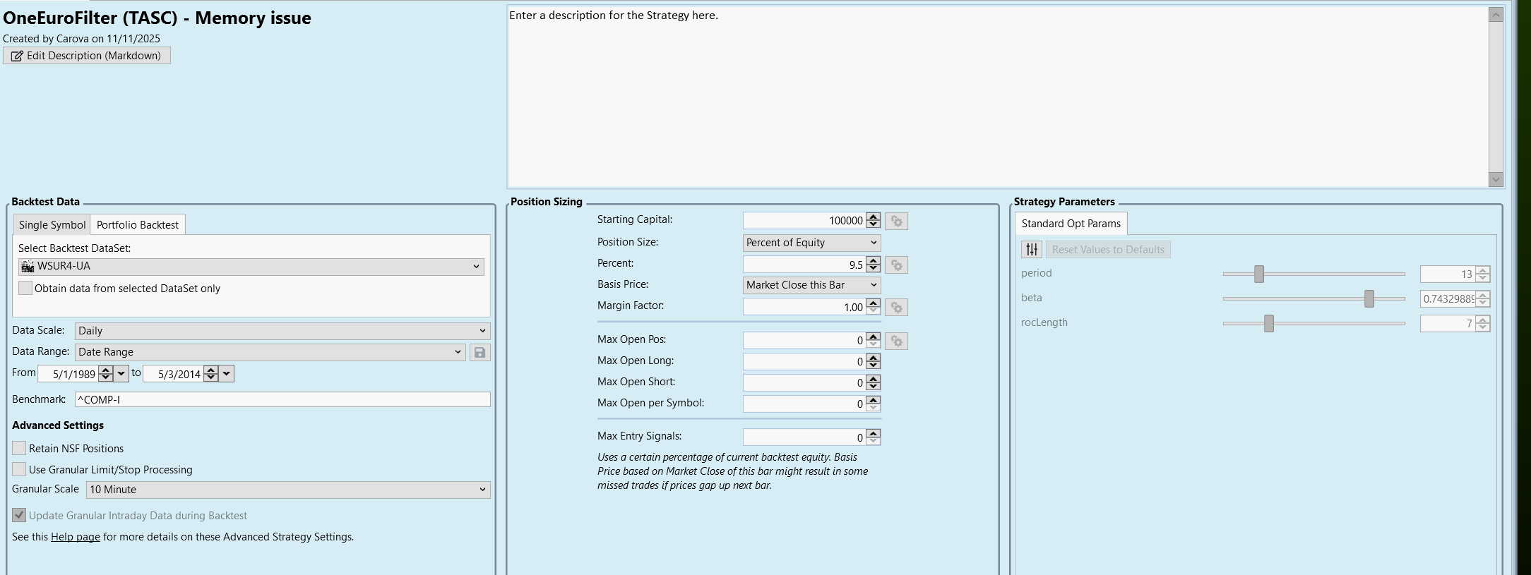 I looked at the OneEuroFilter code and it looks squeaky clean. In any case, you are using Series calls for OneEuroFilter and ROC. And, for exhaustive optimization, you've got over 95,000 permutations. The Series calls end up caching the resulting TimeSeries for each permutation. Hence, the memory is just going to keep going up and up and up. So, you might want to change those Series calls to use new (constructor). Of course there are trade-offs. Using new will cause many recalculations, and some more garbage collection, but less overall memory use (I tested it). I don't know what the impact of the overall time is because I didn't want to let it run for 17 hours. :)