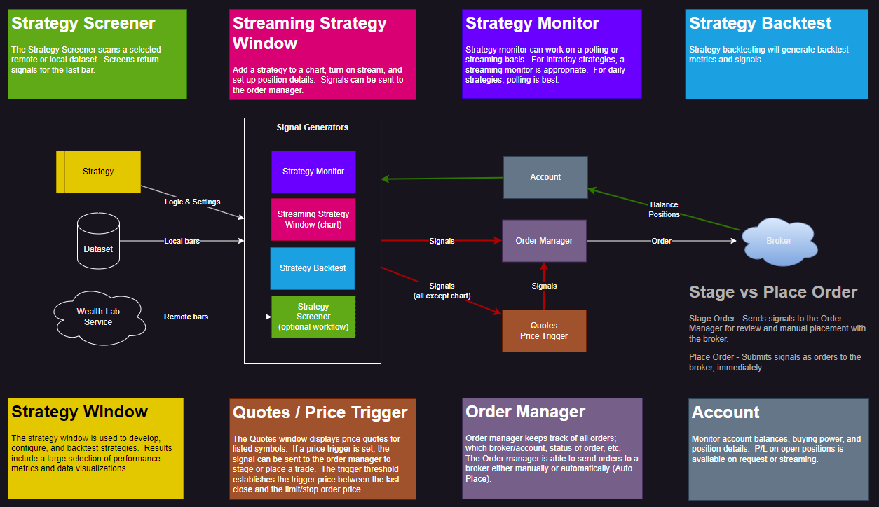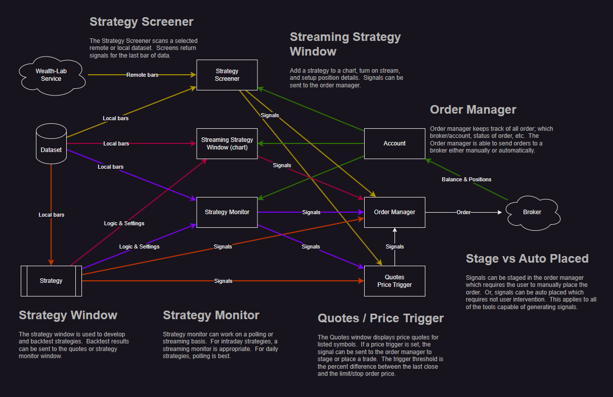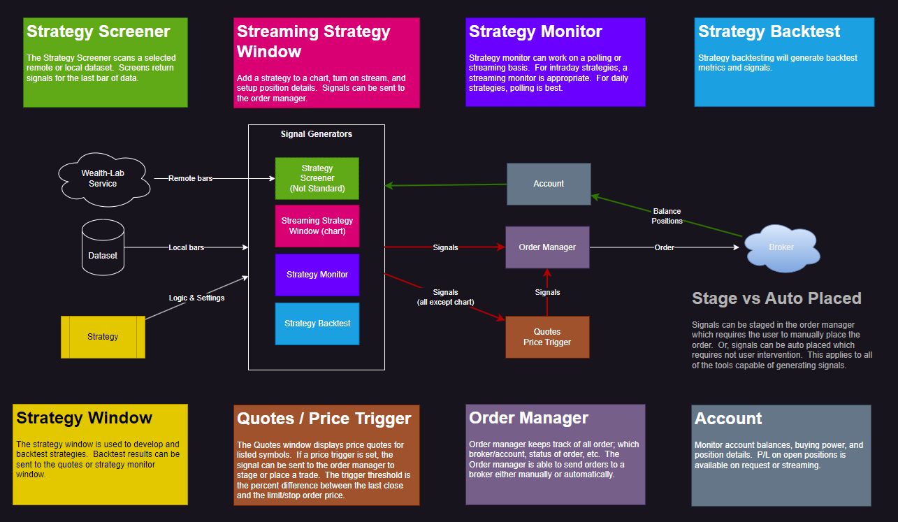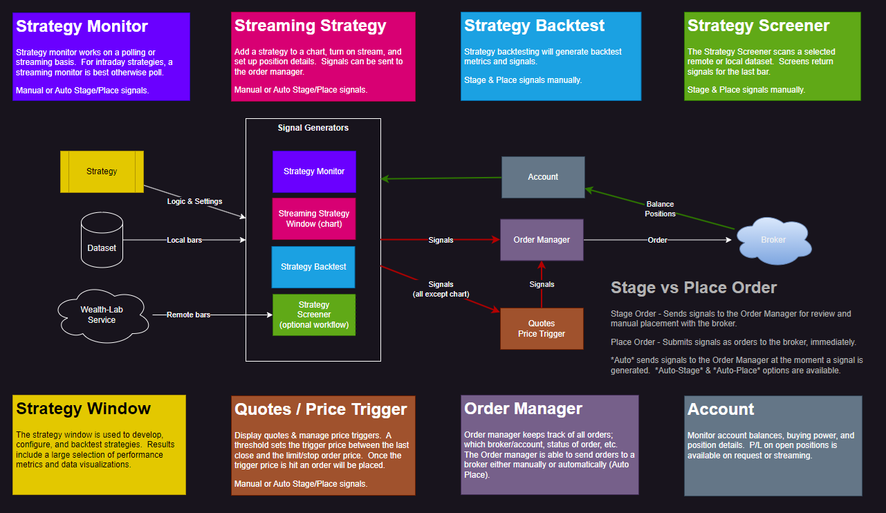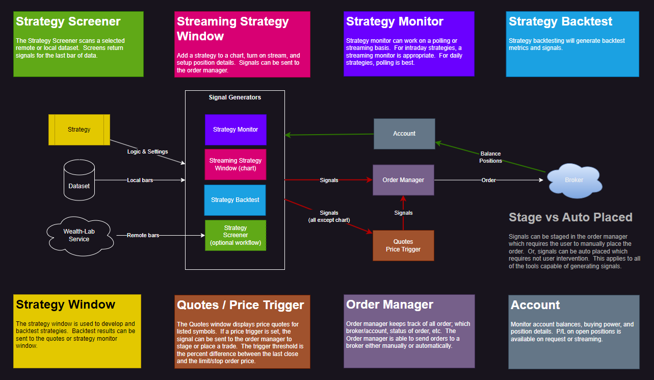 Please review the below diagram. Did I capture this correctly? I'm just now getting into the signal to order portion of WL, and I've read pretty much all of the help files. If I'm understanding correctly, then this diagram should represent the options for generating signals and managing orders.