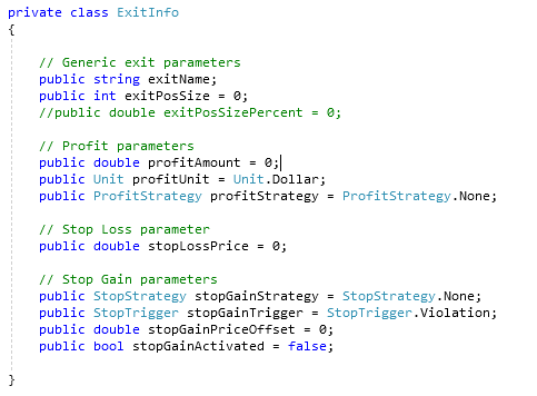 Just for additional context, the object that I'm assigning to the Tag property is a List of instantiated ExitInfo objects I created to hold a bunch of exit parameters related to the trade - see the class definition below. The concept is once a trade is executed, the Tag property will carry a list of all planned exits for that position. A List<ExitInfo>() {exitA, exitB, exitC}; is being created and then assigned to the Tag property of the Transaction instance that opened a new position (which WL8 then assigns to the Tag property of the Position instance created).