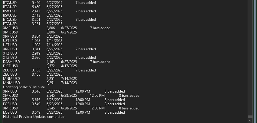 public override void Initialize(BarHistory bars) { string s = $"|{bars.Symbol,-10}|{bars.Symbol,10}|{bars.LastValue.ToString("N3"),20}|{bars.Count,-12}|"; WriteToDebugLog(s, false); }