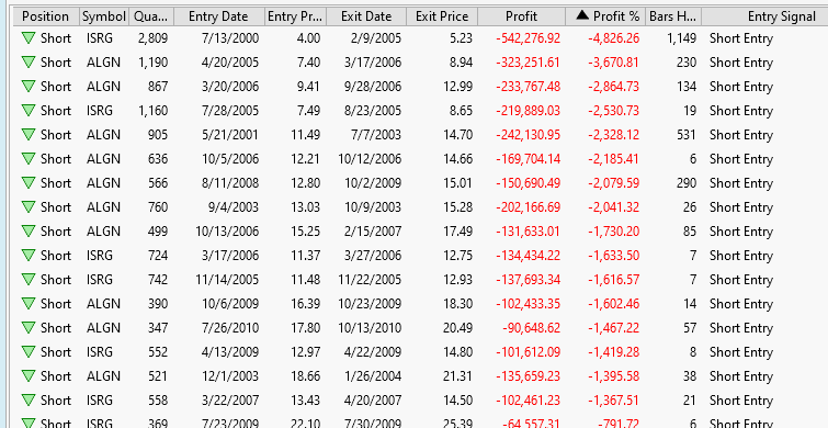 using WealthLab.Backtest; using System; using WealthLab.Core; using WealthLab.Indicators; namespace WealthScript1 { public class MyStrategy : UserStrategyBase { public override void Initialize(BarHistory bars) { atr10 = new ATR(bars, 10); rsi3 = new RSI(bars.Close, 3); StartIndex = 20; } public override void Execute(BarHistory bars, int idx) { //=== Exit === Position p = LastOpenPosition; if (p != null) { // Stop Loss ClosePosition(p, OrderType.Stop, p.EntryPrice + 3.0 * atr10[p.EntryBar], "Stop Loss"); if (p.IsOpen) { // Profit taking: 4% if (p.ProfitPercent > 4.0) { ClosePosition(p, OrderType.MarketClose, 0.0, "Take Profit"); } } } //=== Entry === // One position per symbol if (p != null && p.IsOpen) return; //--- Setup --- // RSI above ninety if(rsi3[idx] <= 90.0) return; // The last two days the close was higher than the previous day if(bars.Close[idx] <= bars.Close[idx-1]) return; if(bars.Close[idx-1] <= bars.Close[idx-2]) return; // sell short four percent above previous close Double limit = bars.Close[idx] * 1.04; Transaction t = PlaceTrade(bars, TransactionType.Short, OrderType.Limit, limit, "Short Entry"); } // private variables IndicatorBase avgTurnover, atr10, rsi3; } }