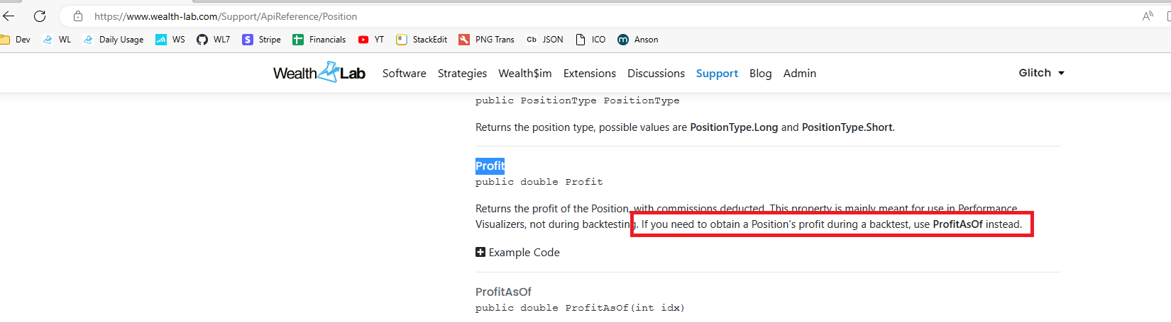 When attempting to capture the profit of an open position in strategy code, the intention is to use ProfitPctAsOf instead of ProfitPercent. Using ProfitPercent causes some unwanted side effects. We'll create an issue to address the side effects because this could surprise users who attempt to use Profit/ProfitPercent in this way.