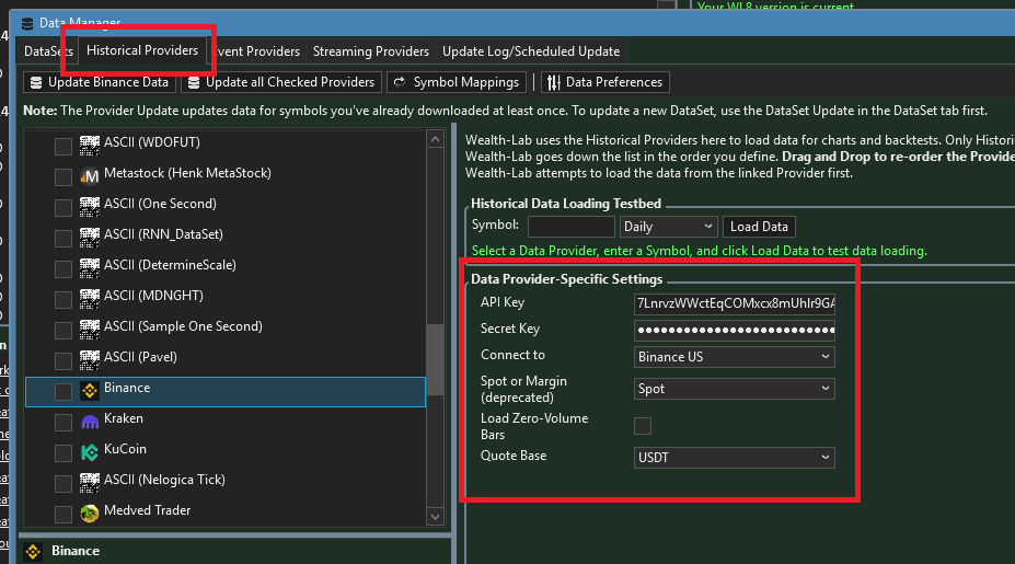 Go to Data Manager, Historical Providers tab, then select Binance. Enter your API Key and Secret Key. Then select Binance or Binance US depending on which entity you set up your account with.
