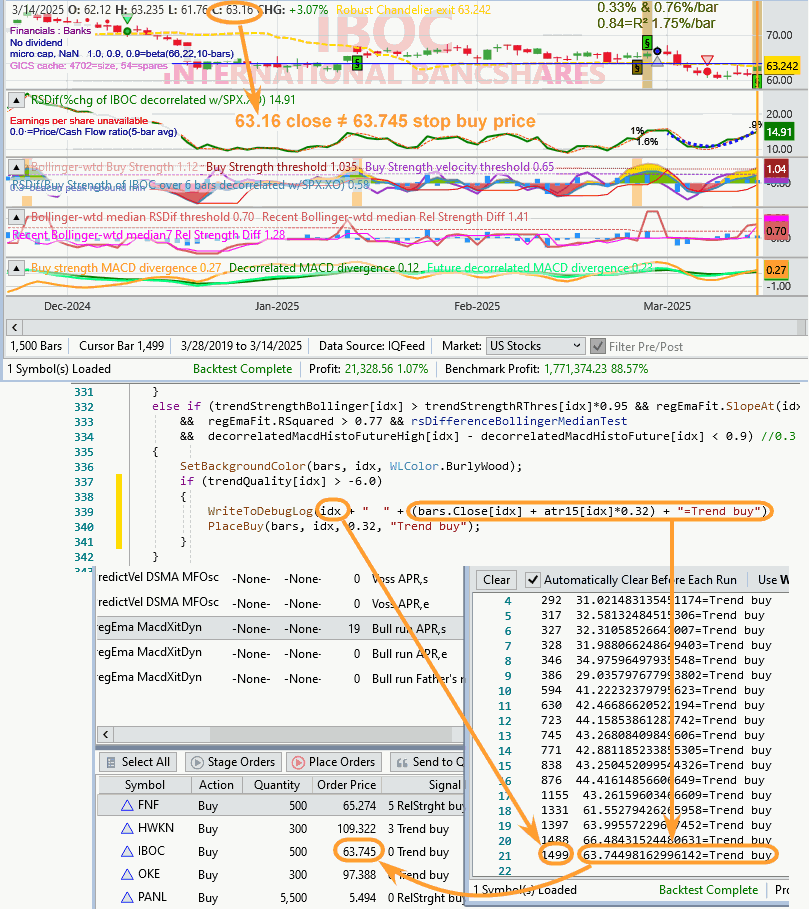 The numbers I'm looking at are the Close for the final bar (idx=bars.Count-1 =1499) of the Chart, bars.Close[idx], and the computed Stop Buy price for the off-the-Chart bar. I appreciate you are referencing different numbers. Which numbers are those?