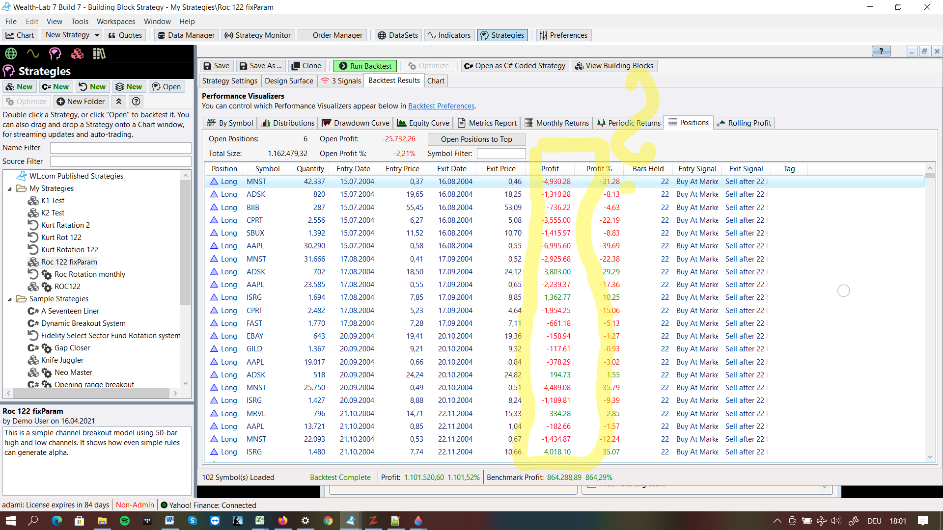 The strategy is selling wrong stocks (PTON) and the Performance has also changed from Build 6? I have made a PDF of the screens in WL7.