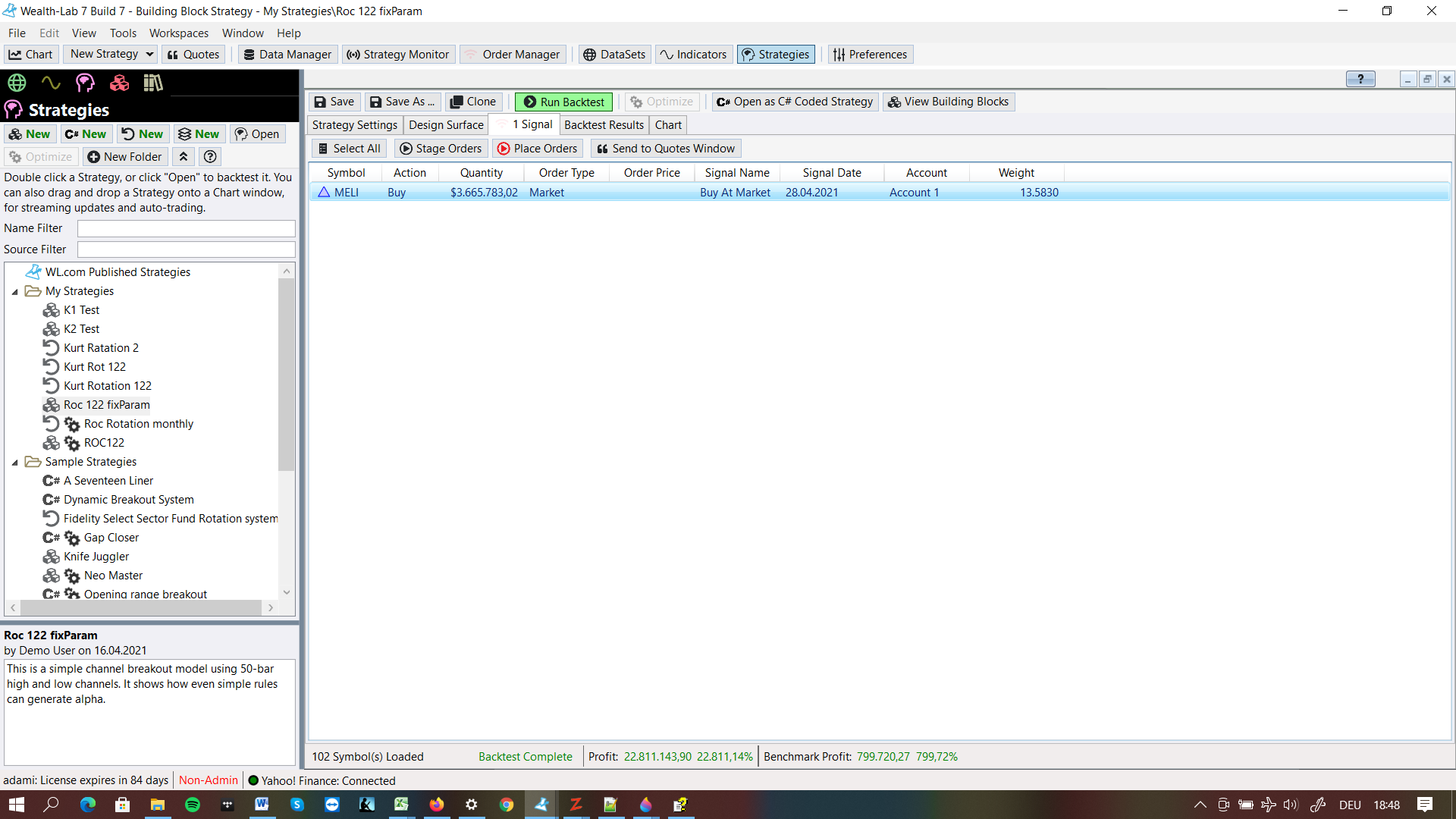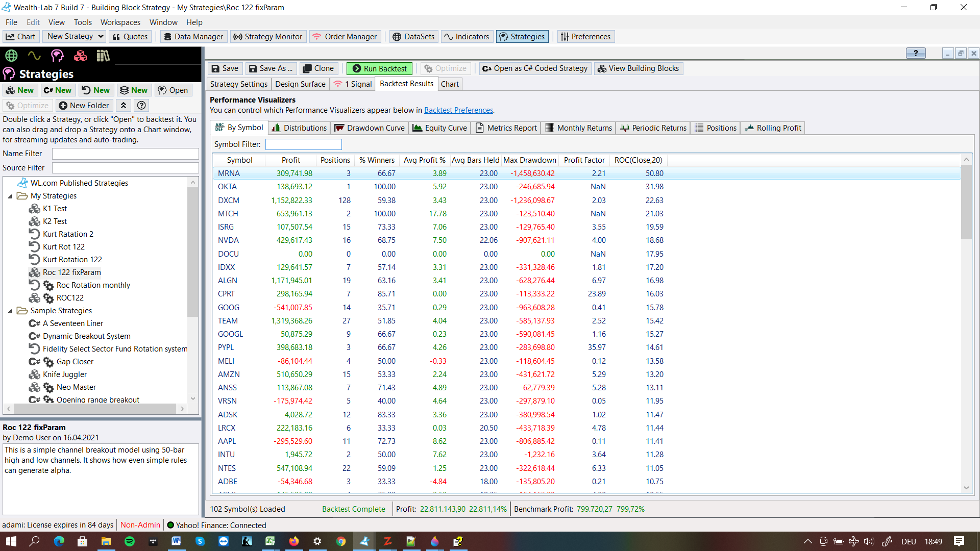 These screenshots in Post #7 compare apples to oranges, so there's no connection between MRNA being the symbol with the highest ROC on the By Symbol tab (in history) and the signal to buy MELI (which takes place tomorrow).