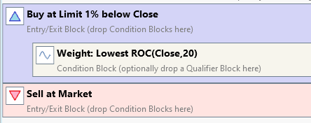 If more than 5 symbols (say 50) hit their limit price during the day, the backtest will pick 5 of the 50 symbols by Weight - in your example, the ones with the Lowest ROC. This is HIGHLY UNREALISTIC. (Using Weight in this manner is only realistic with Market orders because you can choose which orders you place in the Market by Weight.)