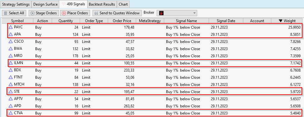 These are the signals (sorted by weight, highlighted are the symbols which met their price limit the next day [2023/11/30]):