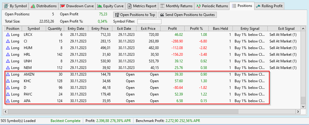 When I do the backtest, I can see, that almost every day 5 symbols were bought and the system has an exposure of almost 98%.