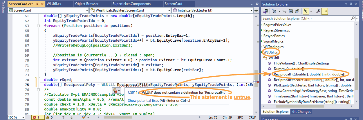 I added some new methods to one Visual Studio assembly (which contains WLUtil.cs). The problem is another existing assembly (ScreenCard.cs) doesn't seem to recognize the new methods added. I tried saving and restarting Visual Studio, but that didn't help.